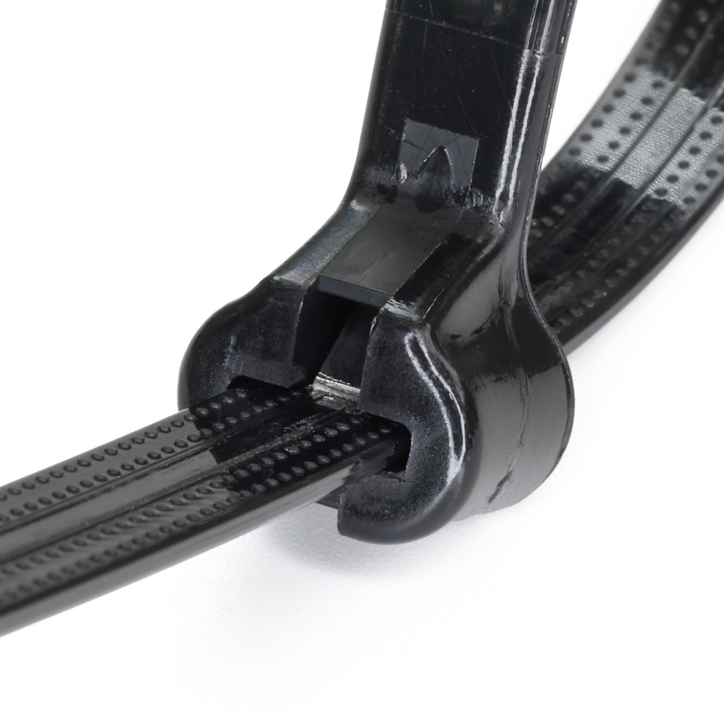 Nylonové stahovací pásky s kovovými zuby s kovovým uzamykacím zubem z nerezové oceli, který uzamkne stahovací pásku v požadované poloze, aniž by bylo nutné ji vroubkovat. Díky tomu zůstávají kabelové stahovací pásky pružné i při nízkých teplotách. / Barva: černá nebo přírodní / Materiál: Nylon PA66 / Pracovní teplota: -40 °C až +60 °C / Délka: 100 mm - 360 mm / Šířka: 2,5 mm - 7,5 mm / Pevnost v tahu: 18 kg - 80 kg / Max. průměr svazku: 24 mm - 101 mm / Třída samozhášivosti: UL94V2 / ROHS Compliant / Zero Halogen